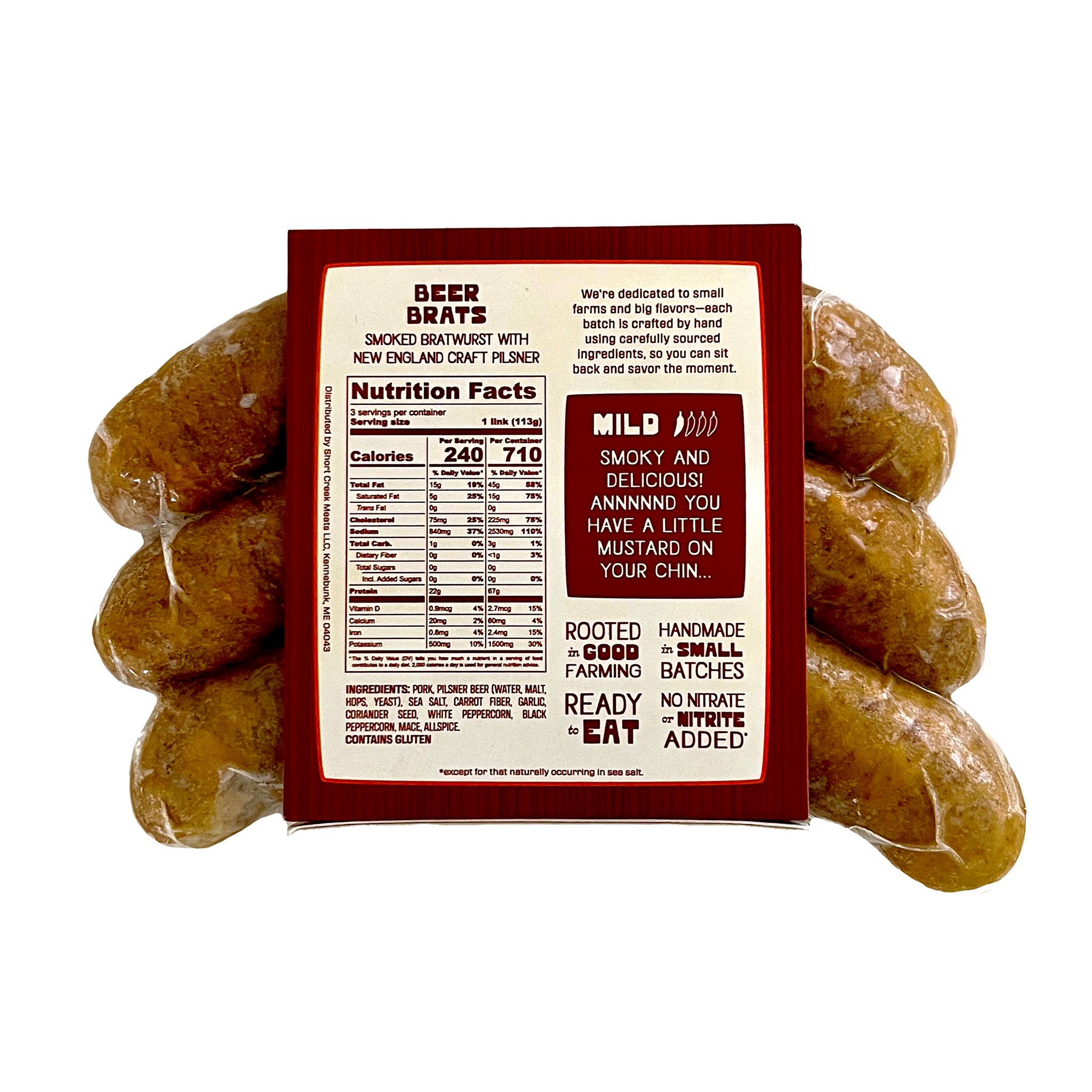 PORK, PILSNER BEER (WATER, MALT, HOPS, YEAST), SEA SALT, CARROT FIBER, GARLIC, CORIANDER SEED, WHITE PEPPERCORN, BLACK PEPPERCORN, MACE, ALLSPICE