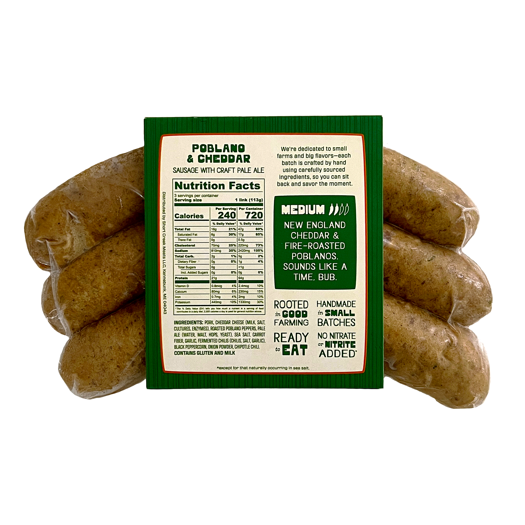 PORK, CHEDDAR CHEESE (MILK, SALT, CULTURES, ENZYMES), ROASTED POBLANO PEPPERS, PALE ALE (WATER, MALT, HOPS, YEAST), SEA SALT, CARROT FIBER, GARLIC, FERMENTED CHILIS (CHILIS, SALT, GARLIC), BLACK PEPPERCORN, ONION POWDER, CHIPOTLE CHILI